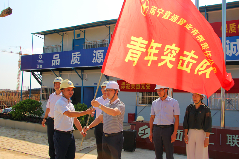 南寧空港科技產(chǎn)業(yè)園項(xiàng)目是南寧空港經(jīng)濟(jì)區(qū)的重點(diǎn)龍頭標(biāo)桿性產(chǎn)業(yè)項(xiàng)目,也是南寧市重點(diǎn)督辦的建設(shè)項(xiàng)目。為了更好地服務(wù)項(xiàng)目工程建設(shè),進(jìn)一步發(fā)揮黨員的先鋒帶頭作用和青年同志們的工作熱情,確保一期工程按時交付和整體項(xiàng)目早日竣工投產(chǎn),2018年9月29日上午,綠港集團(tuán)黨委在空港科技產(chǎn)業(yè)園項(xiàng)目施工現(xiàn)場隆重舉行“黨員先鋒隊(duì)”、“青年突擊隊(duì)”、“工人先鋒號”授旗儀式暨“一線送清涼”活動,綠港集團(tuán)黨委書記、董事長、總經(jīng)理龔國強(qiáng),副總經(jīng)理鄧?yán)^慧,副總經(jīng)理黃克,副總經(jīng)理、工會主席黃麗琴,項(xiàng)目“黨員先鋒隊(duì)”隊(duì)員、“青年突擊隊(duì)”隊(duì)員、項(xiàng)目一線建筑工人代表等共約80人參加了活動。